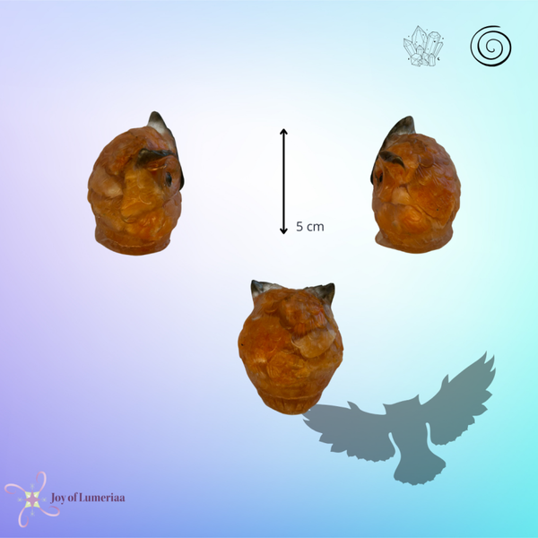 Een uil is ongeeer 5 cm hoog. Elke uil bevat 50 gram kristallen en een koperspiraal van18 cm.